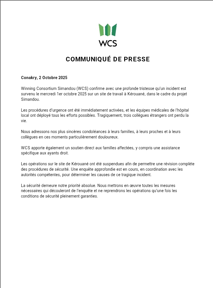 L e Winning Consortium Simandou (WCS) a confirmé, jeudi 2 octobre 2025, dans un communiqué, qu’un accident tragique est survenu le mercredi 1er octobre 2025 sur l’un de ses sites de travail à Kérouané, dans le cadre du projet Simandou. L’incident a coûté la vie à trois travailleurs étrangers.