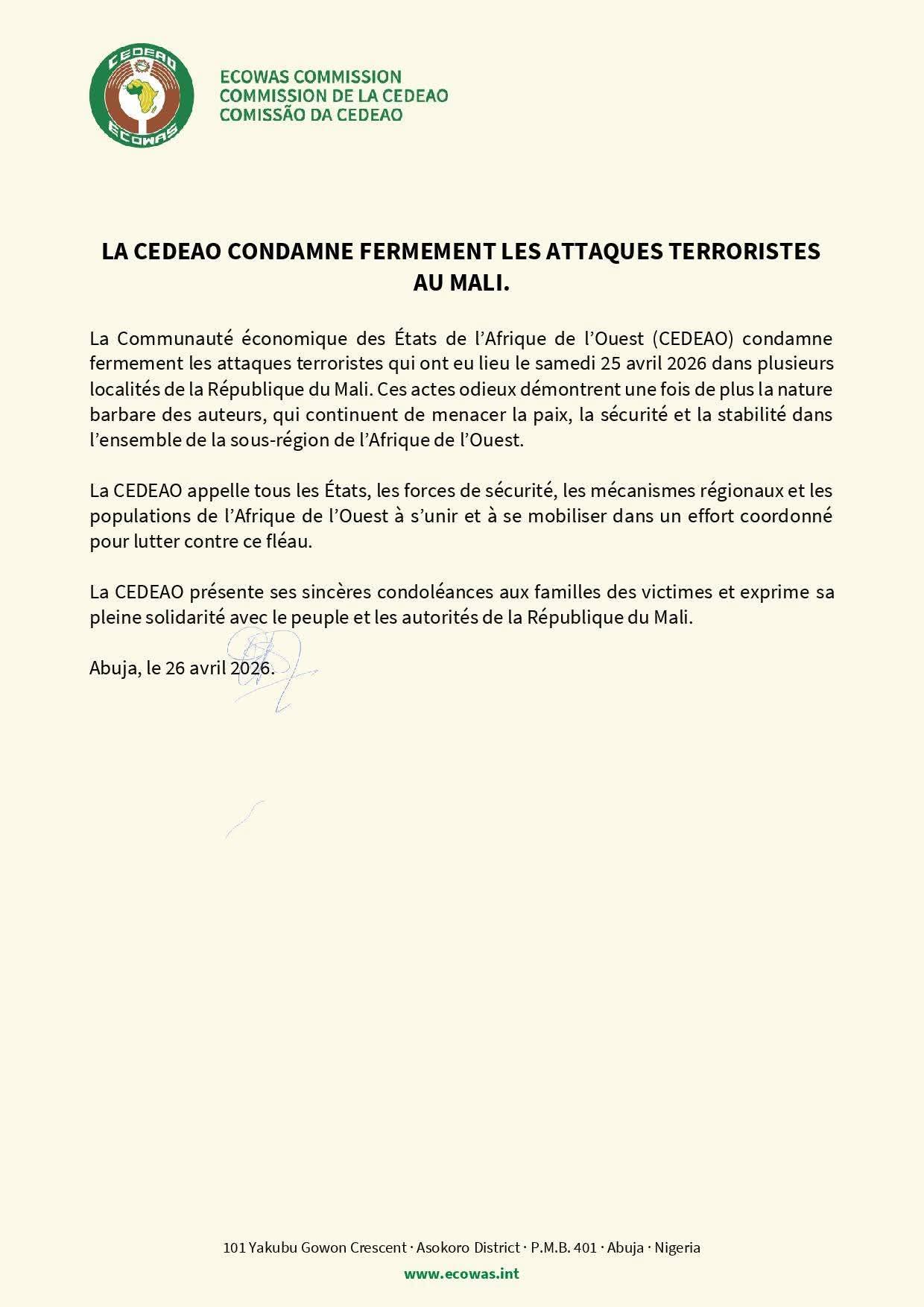 L a Communauté économique des États de l’Afrique de l’Ouest a condamné, dimanche 26 avril 2026, les attaques terroristes survenues la veille dans plusieurs localités du Mali.