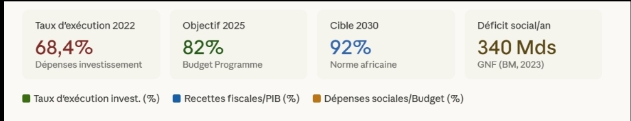 Le ministère de la Santé et de l’Hygiène publique, dont le budget programme 2025 est fixé à 4 800 milliards GNF selon les projections de la Loi-Programme 2026–2030, porte l’indicateur phare de la réforme en termes d’impact social, la réduction de la mortalité infantile à moins de 50 pour 1 000 naissances vivantes d’ici 2030, contre un taux estimé à environ 65 pour 1 000 en 2023. Chaque centime alloué à ce programme sera désormais évalué à l’aune de cet objectif.