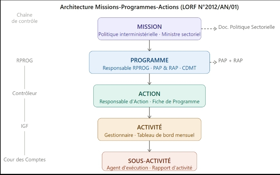 La réforme ne surgit pas du néant. Son fondement juridique est la Loi Organique N° 2012/AN/01 du 22 décembre 2012 relative aux Lois de Finances (LORF), complétée par le Décret N° D/2012/279/PRG/SGG du 31 décembre 2012 portant Règlement Général sur la Comptabilité Publique. Ces textes fondateurs, adoptés il y a plus d’une décennie, ont institué le cadre normatif de la gestion axée sur les résultats. Mais c’est seulement pour l’exercice 2025 que la mise en œuvre effective du Budget Programme a été officiellement lancée, marquant la pleine application des dispositions de la LORF après une phase de transition de treize ans, phase portée par le Plan d’Action de Réforme des Finances Publiques (PARFP) 2022–2026 et le Comité National de Pilotage de la Réforme des Finances Publiques.