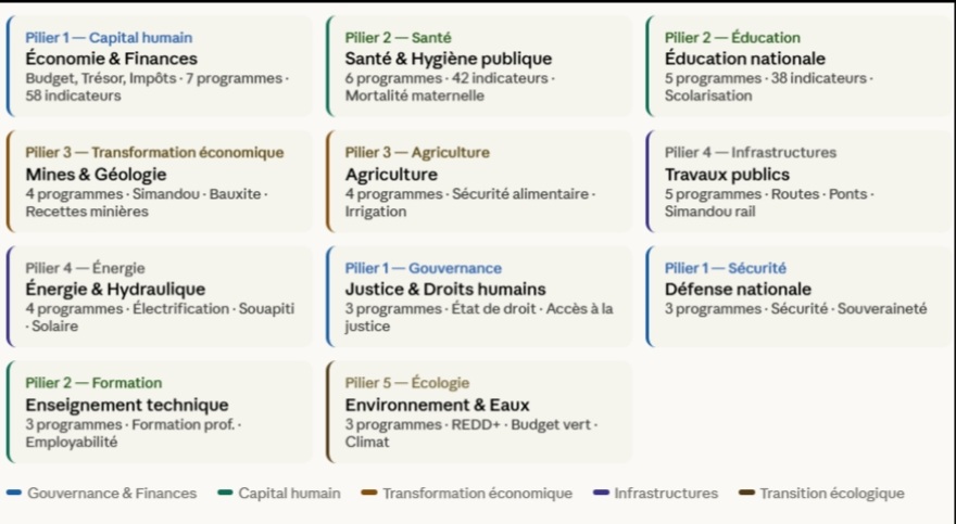 Ces onze ministères représentent collectivement environ 73% du budget total de l’État guinéen pour 2025, estimé à 31 200 milliards de francs guinéens (GNF). Ils sont responsables de 47 des 60 programmes budgétaires créés pour l’exercice, et portent 340 des 500+ indicateurs de performance prévus à l’horizon 2030. Le ministère de l’Économie et des Finances, chef de file de la réforme, structure à lui seul 7 programmes autour desquels gravitent les fonctions régaliennes de la gestion budgétaire : programmation des ressources, régulation de l’exécution, gestion de la trésorerie et contrôle de la performance.