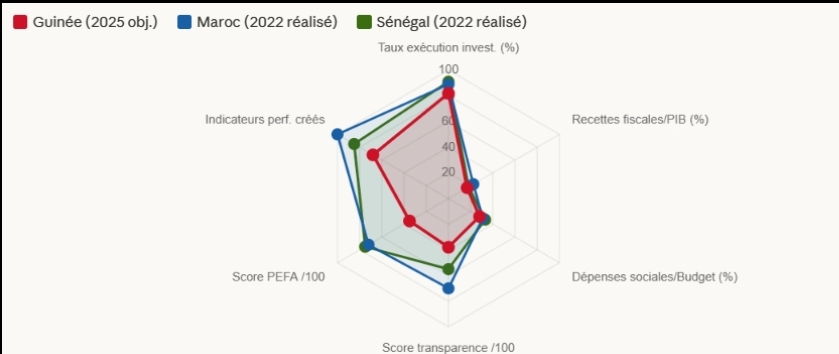 Le radar de benchmarking révèle sans ambiguïté le chemin parcouru et celui qui reste à parcourir. La Guinée, au stade initial du déploiement de son Budget Programme, présente des performances encore inférieures à celles du Maroc et du Sénégal sur la plupart des dimensions. Mais la trajectoire de ses indicateurs sur les trois dernières années montre une convergence dynamique vers les standards de performance de ces deux pays. Avec un score de transparence budgétaire encore modeste (environ 38/100 contre 70 pour le Maroc), la Guinée doit investir massivement dans la publication et la communication de ses RAP, la mise en ligne des données budgétaires et le renforcement du contrôle parlementaire.