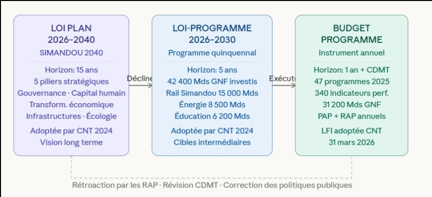 La LFI adoptée le 31 mars 2026 traduit en langage budgétaire les ambitions de la Loi Plan 2026-2040 (Simandou 2040) et de la Loi-Programme 2026-2030, toutes deux adoptées par le CNT en 2024, formant ainsi le triptyque stratégique inédit de la modernisation financière guinéenne.