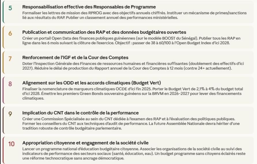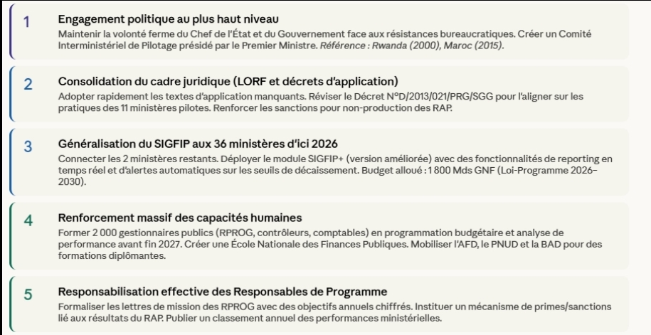 Fondées sur l’analyse comparative des réformes africaines (Maroc, Sénégal, Rwanda, Afrique du Sud) et des évaluations FMI/Banque Mondiale de la réforme guinéenne