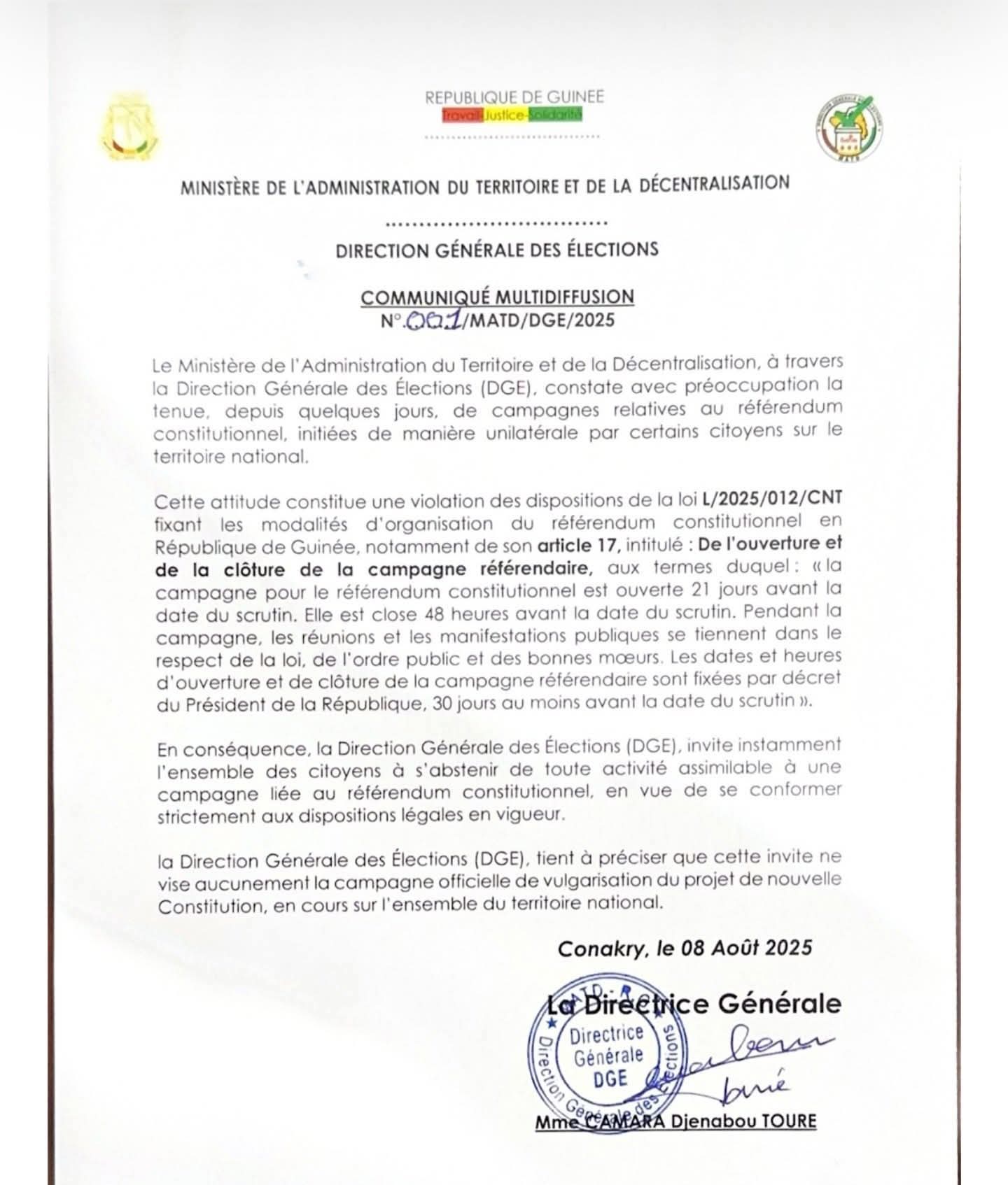 La DGE invite donc les citoyens à s’abstenir de toute activité pouvant être assimilée à une campagne référendaire prématurée, afin de respecter les dispositions légales en vigueur.