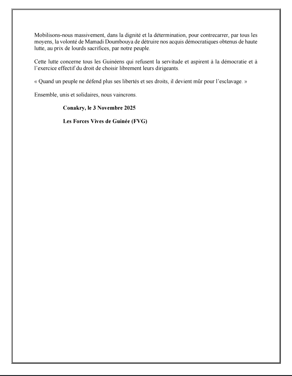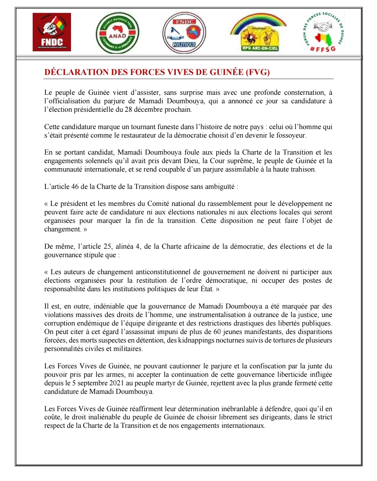 L es Forces Vives de Guinée (FVG) ont publié ce lundi 3 novembre 2025 une déclaration dénonçant la candidature du général Mamadi Doumbouya à l’élection présidentielle prévue le 28 décembre prochain.