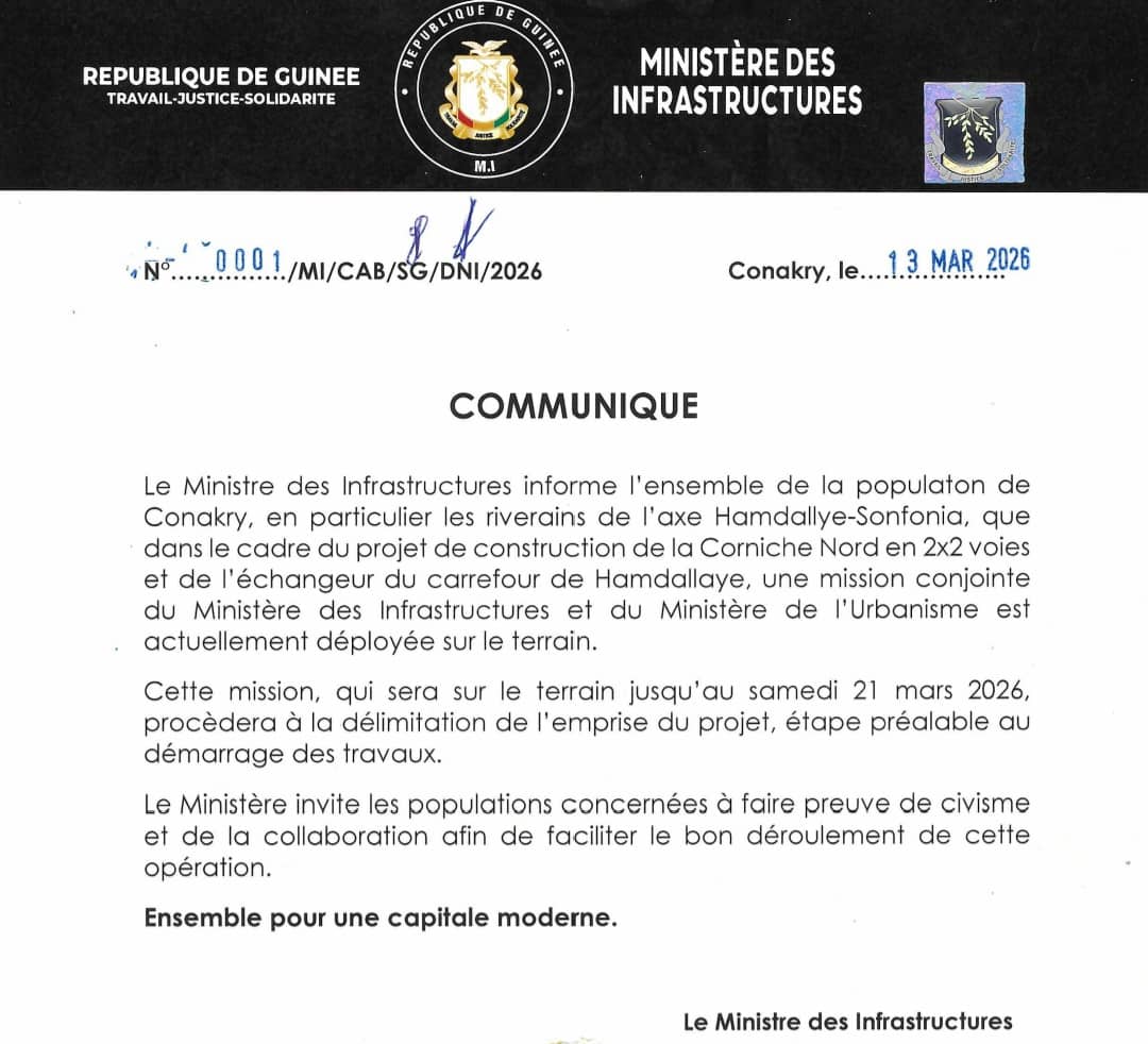 Le ministère précise que cette démarche vise à préparer les travaux d’aménagement de cette infrastructure, considérée comme un axe stratégique pour l’amélioration de la mobilité urbaine dans la capitale guinéenne.