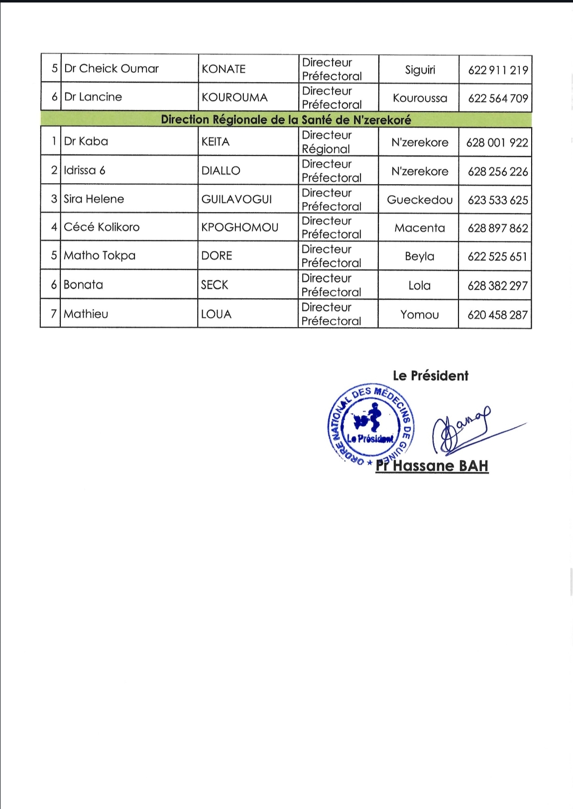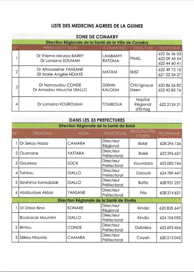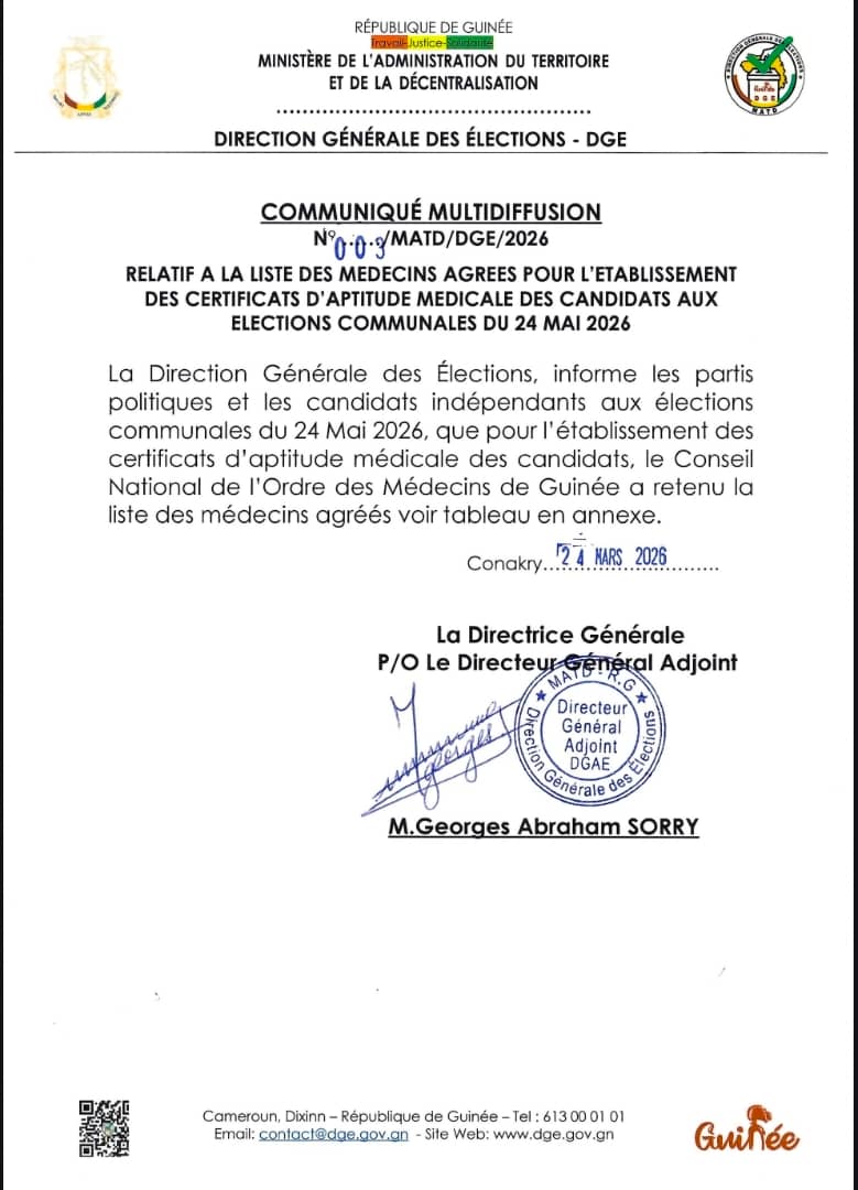 Le document, signé par M. Georges Abraham SORRY, Directeur Général Adjoint, précise que le Conseil National de l’Ordre des Médecins de Guinée a désormais établi la liste officielle des praticiens autorisés à délivrer les certificats d’aptitude médicale.