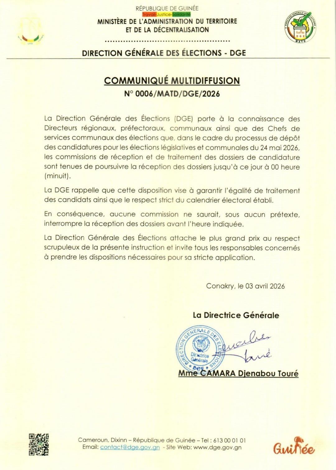 L a Direction générale des élections (DGE) a annoncé, dans un communiqué diffusé vendredi 3 avril, la poursuite de la réception des dossiers de candidature dans le cadre des élections législatives et communales prévues le 24 mai 2026.