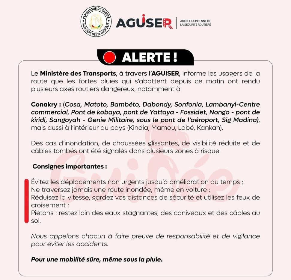 L ’Agence Guinéenne de la Sécurité Routière (AGUISER), relevant du ministère des Transports, a lancé ce samedi 26 juillet 2025 une alerte à l’attention des usagers de la route. Cette mise en garde fait suite aux fortes pluies enregistrées dans la capitale et à l’intérieur du pays, ayant rendu plusieurs axes particulièrement dangereux.