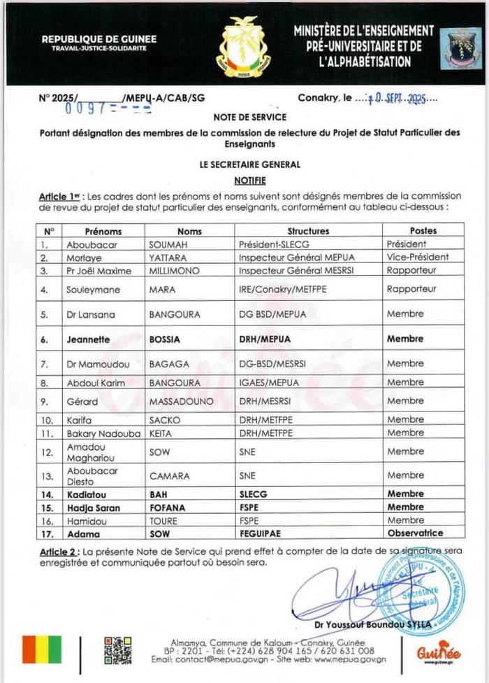 Selon une note de service signée par le secrétaire général du ministère, la commission regroupe des cadres issus des trois ministères du secteur de l’éducation et de la formation, des représentants de l’Intersyndicale de l’éducation (FSPE, SLECG, SNE) ainsi que de la Fédération Guinéenne des Parents d’Élèves et Amis de l’École (FEGUIPAE).