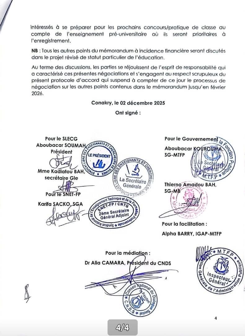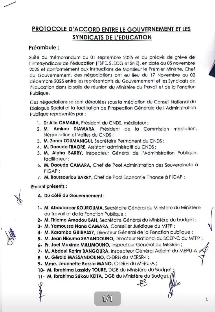L e Gouvernement guinéen et l’Intersyndicale de l’Éducation, composée notamment du SLECG et du SNET-FP, ont signé un protocole d’accord, mardi 2 décembre 2025 à Conakry, au terme de négociations conduites sous la médiation du Conseil National du Dialogue Social (CNDS).