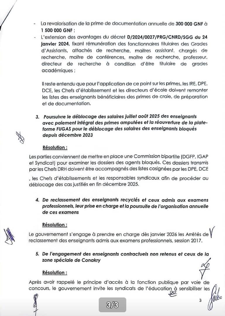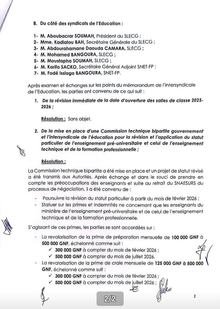 Le protocole prévoit une augmentation progressive de plusieurs primes. La prime de préparation mensuelle et la prime de craie, actuellement inférieures à 150 000 GNF, seront portées à 300 000 GNF en février 2026, puis à 500 000 GNF en juillet 2026.