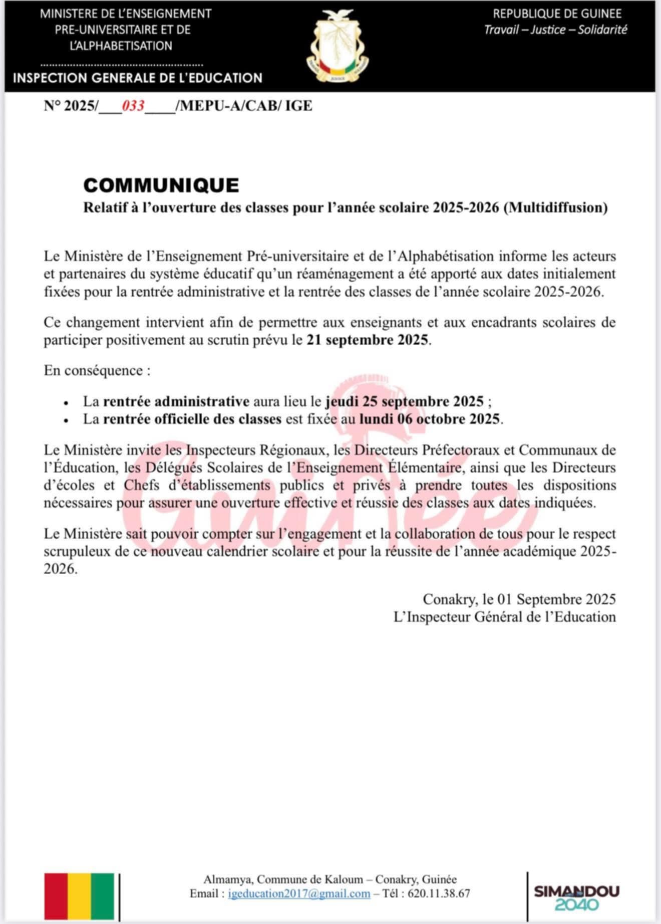 L a rentrée des classes en Guinée, initialement prévue pour le 21 septembre 2025, a été reportée au lundi 6 octobre 2025. Le ministère de l’Enseignement pré-universitaire et de l’Alphabétisation a publié, mardi 2 septembre 2025, un communiqué informant les acteurs éducatifs de ce changement.