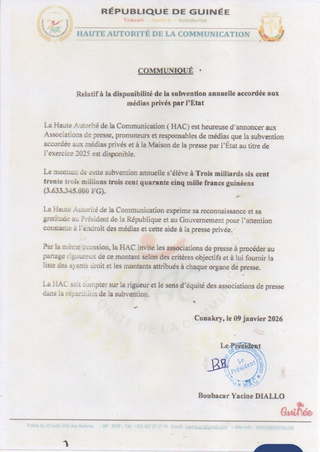 A travers un communiqué publié, vendredi 09 janvier 2026, la Haute Autorité de la Communication (HAC) a annoncé aux associations de presse et aux responsables de médias que la subvention de l’État pour l’exercice 2025 est désormais disponible.