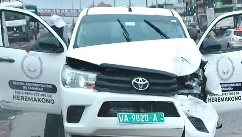 D’après nos informations, le véhicule attribué au sous-préfet de Hérémakono a été accidenté à proximité de la société SODEFA. Le marquage visible sur la carrosserie a permis de confirmer son affectation à cette localité.