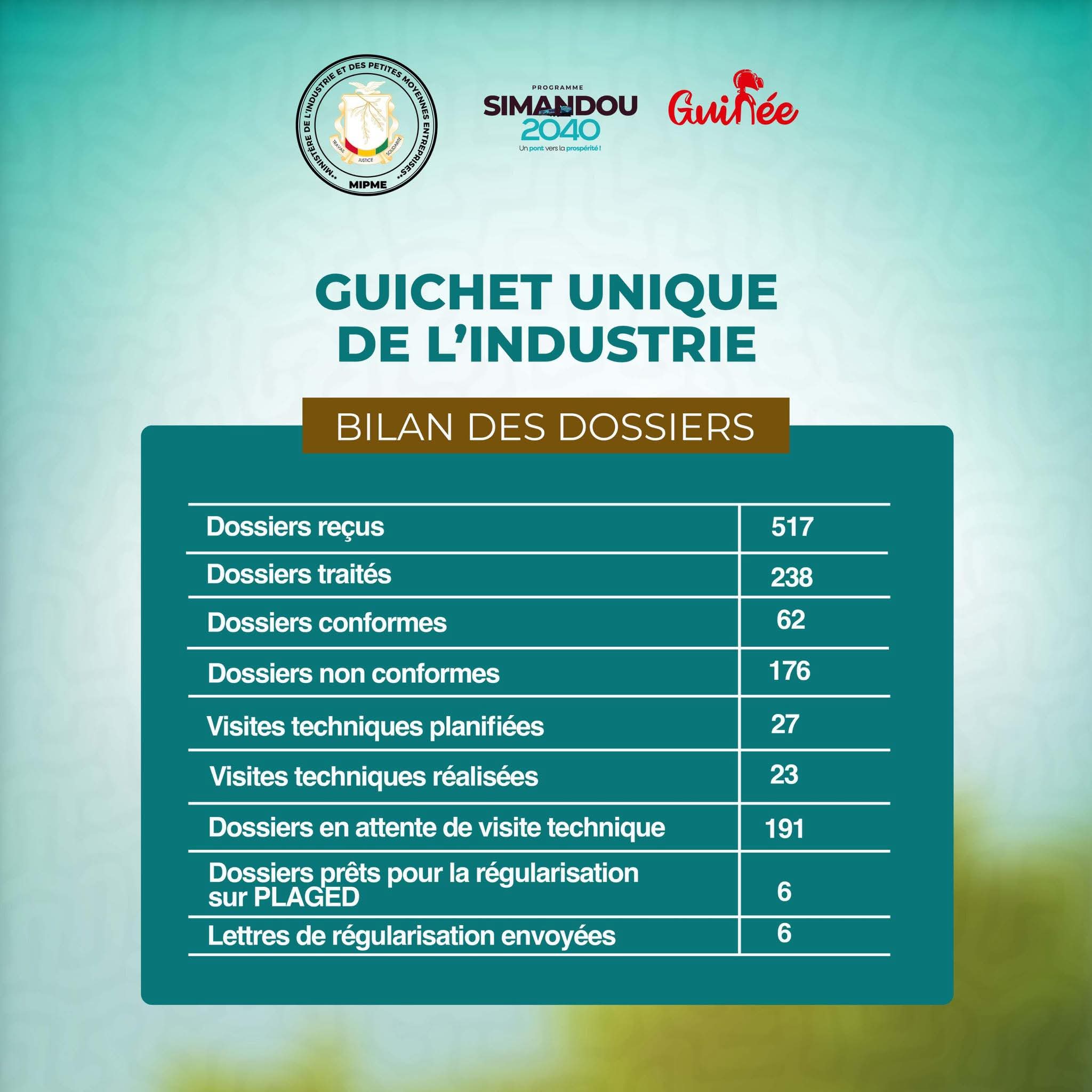 Selon ce bilan, le Guichet Unique de l’Industrie a enregistré 517 dossiers. Parmi eux, 238 ont été traités, dont 62 jugés conformes et 176 considérés comme non conformes.