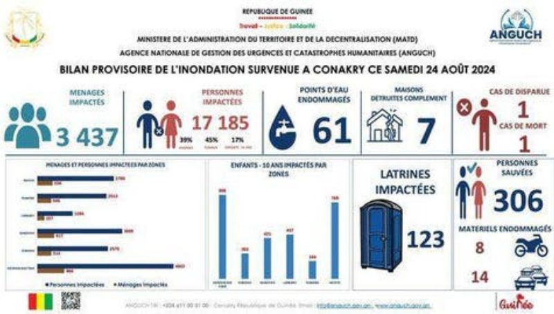 Selon cette structure étatique, ces inondations ont fait un mort, une personne portée disparue et ont impacté 3 437 ménages à Conakry, dont 17 185 personnes touchées dans les différents quartiers de la ville de Conakry.