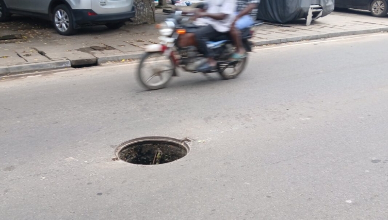 Cette bouche d’égout béante, située sur une route récemment réhabilitée, est empruntée chaque jour par des centaines de piétons ainsi que par des motocyclistes, des véhicules civils et de l’administration.
