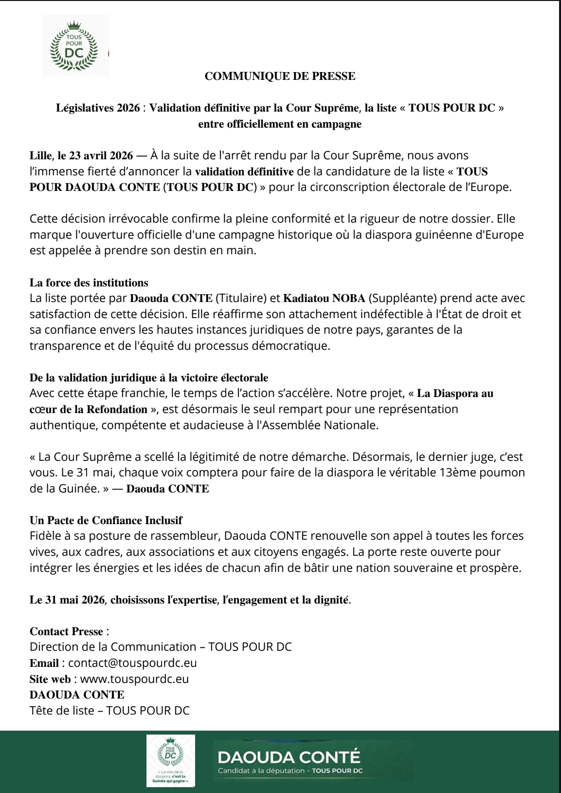 U n communiqué publié le 23 avril 2026 annonce la validation définitive par la Cour suprême de la candidature de la liste « Tous pour Daouda Conté (Tous pour DC) » dans la circonscription électorale de l’Europe, en vue des élections législatives prévues le 31 mai.