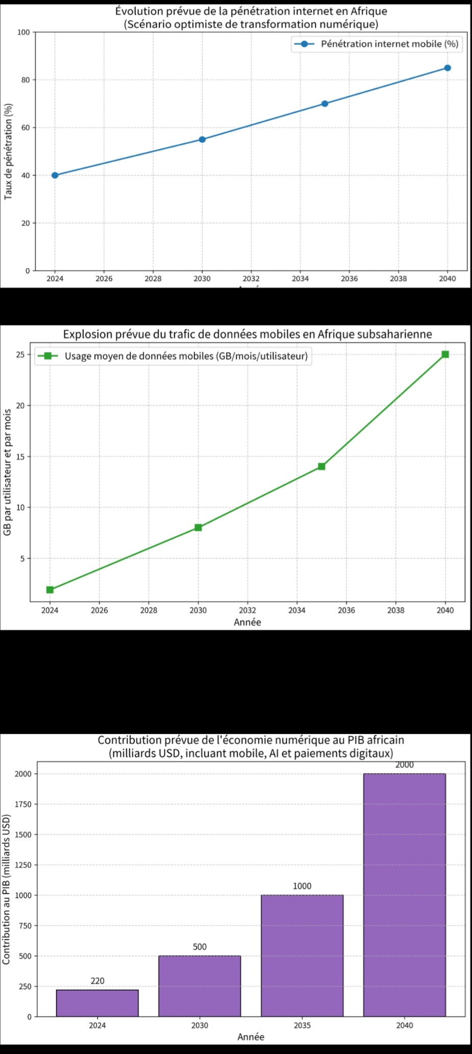 Ces trois graphes (générés à partir des projections GSMA et Ericsson) montrent l’accélération irrésistible : la courbe bleue de la pénétration internet monte en flèche, le trafic data quadruple puis explose, et la contribution numérique au PIB passe d’un complément à un moteur central. On y lit le « redessinage » du social : le patrimoine (liens physiques, transmission orale) perd du terrain face à la data qui devient la nouvelle monnaie relationnelle.