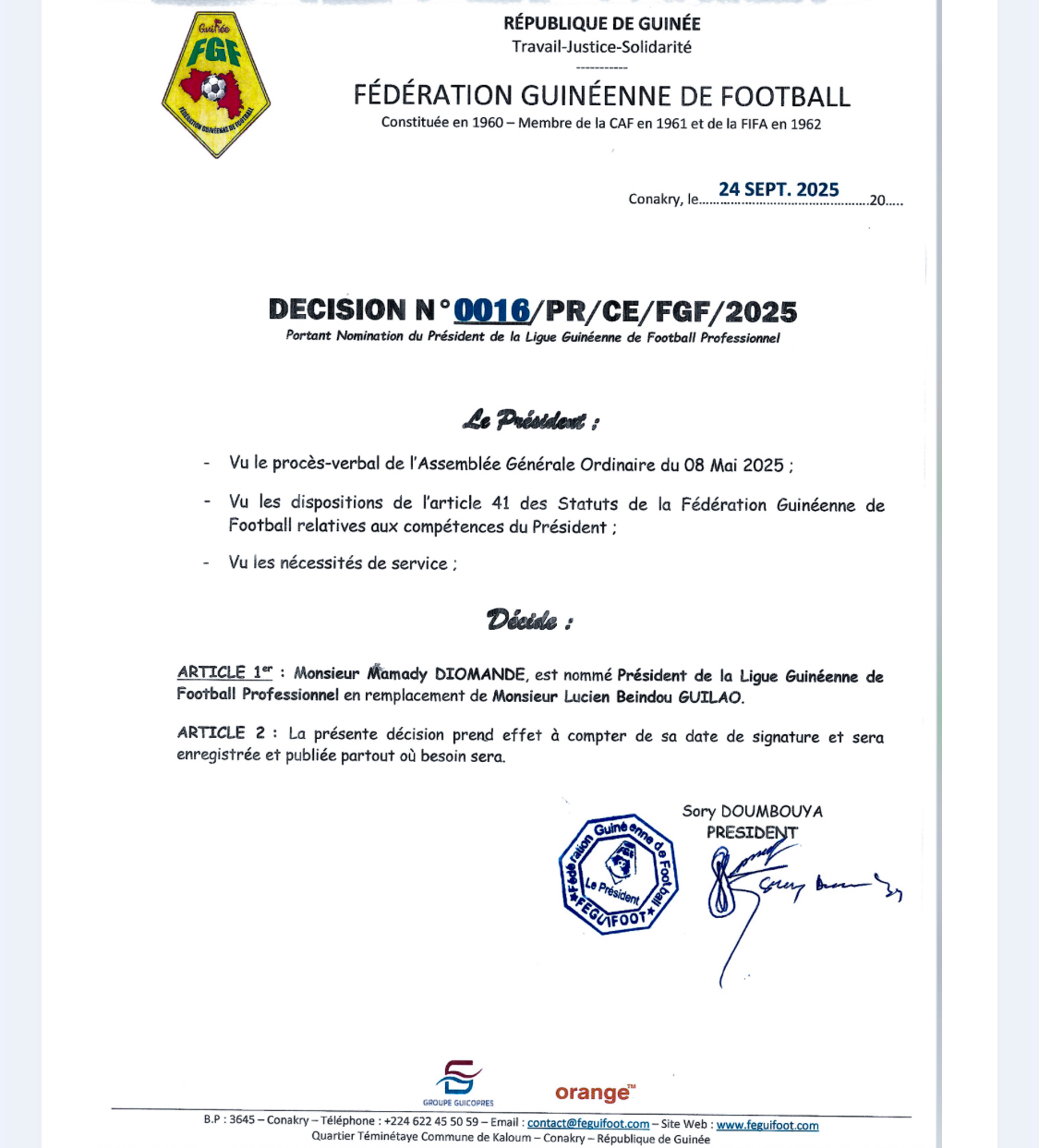 L a Fédération Guinéenne de Football (FGF) a annoncé, mercredi 24 septembre 2025, la nomination de Mamady Diomandé à la tête de la Ligue Guinéenne de Football Professionnel (LGFP).