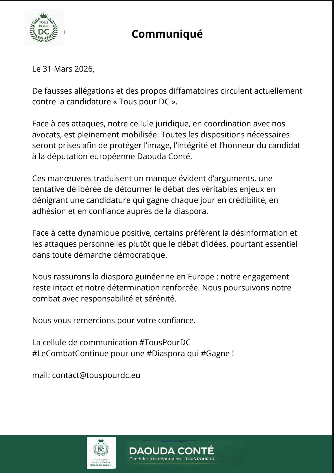 L e mouvement “Tous pour DC” a réagi, dans un communiqué daté du 31 mars 2026, à ce qu’il qualifie de “fausses allégations” visant la candidature de Daouda Conté à la députation européenne.