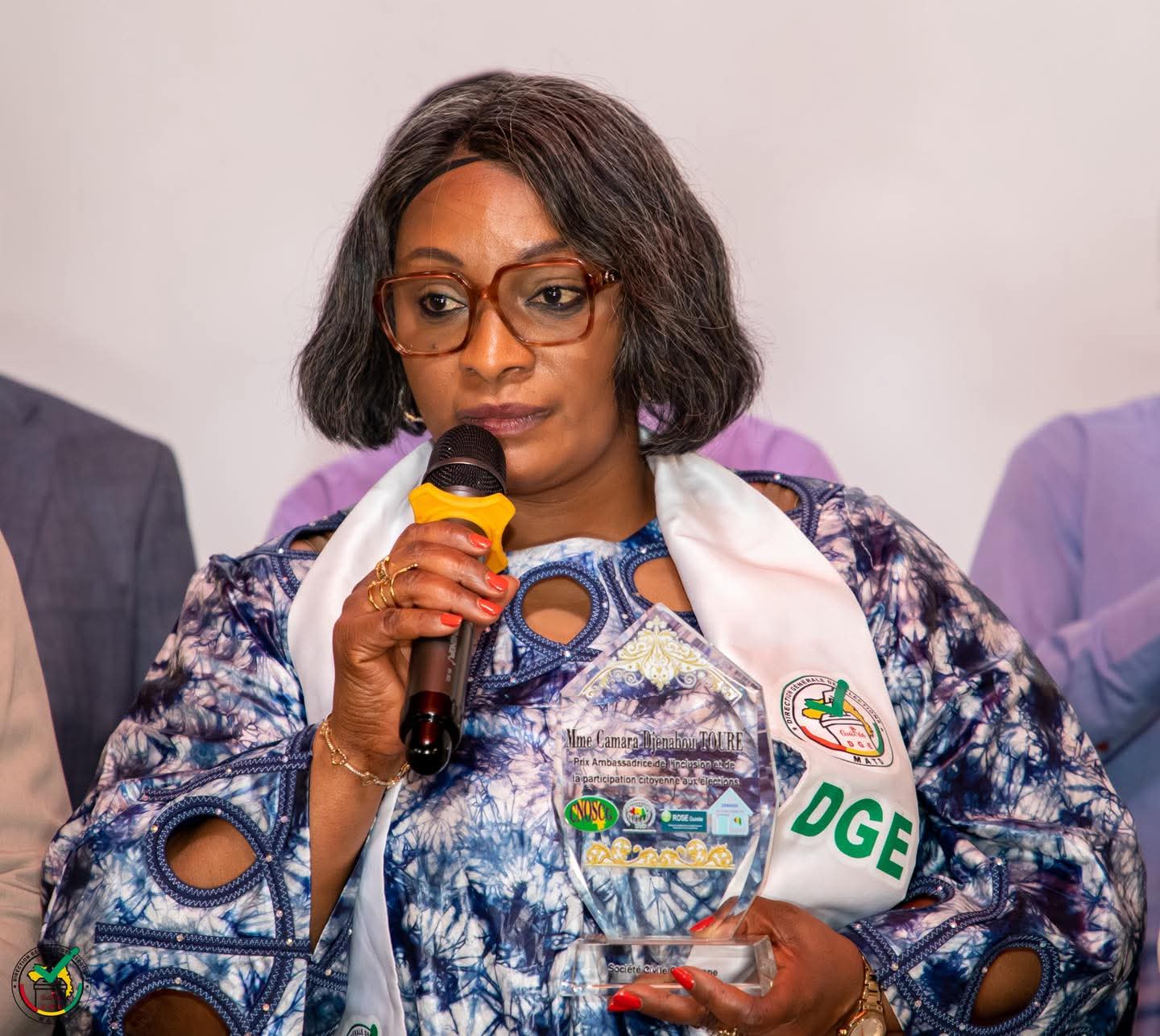 Madame Camara Djenabou Touré a reçu le prix Ambassadrice de l’inclusion et de la participation citoyenne devant l’ensemble des autorités administratives de la région de kindia ainsi que les acteurs impliqués dans le processus électoral en République de Guinée.