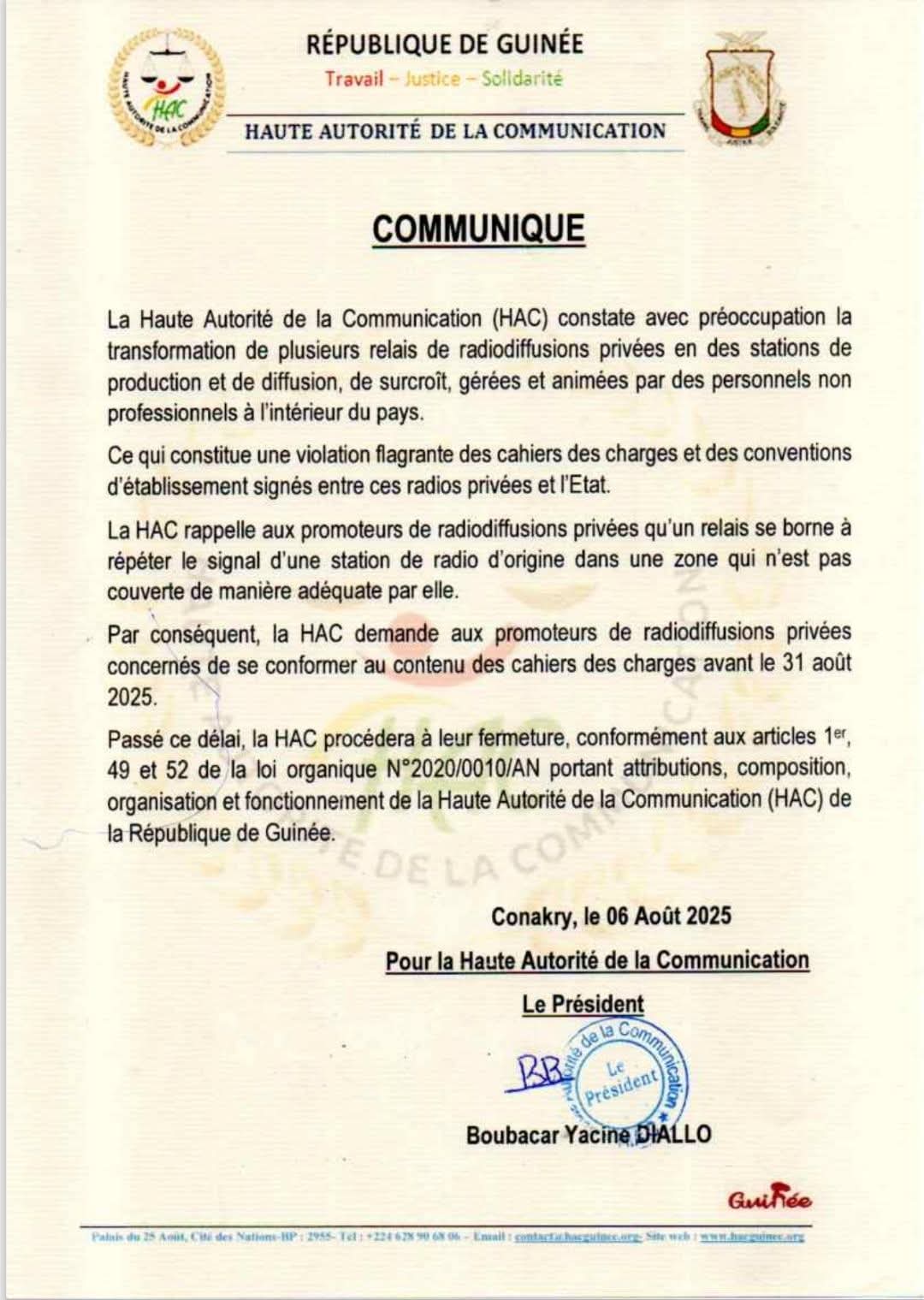 Face à cette situation, la Haute Autorité de la Communication invite les promoteurs des radiodiffusions privées impliqués à se conformer strictement aux obligations contractuelles avant le 31 août 2025.