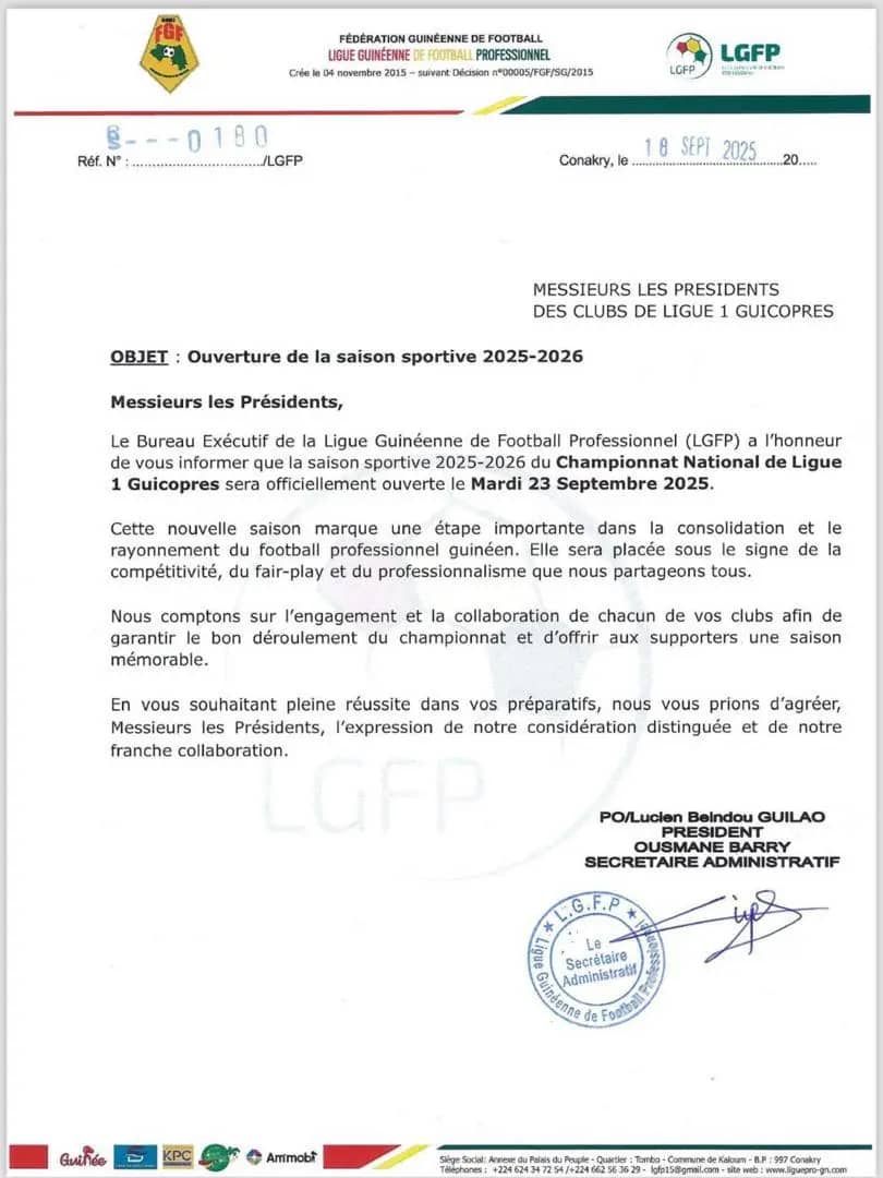 « Nous comptons sur l’engagement et la collaboration de chacun de vos clubs afin de garantir le bon déroulement du championnat et d’offrir aux supporters une saison mémorable », indique la note signée par le président de la LGFP, Lucien Beindou Guilao, et le secrétaire administratif, Ousmane Barry.