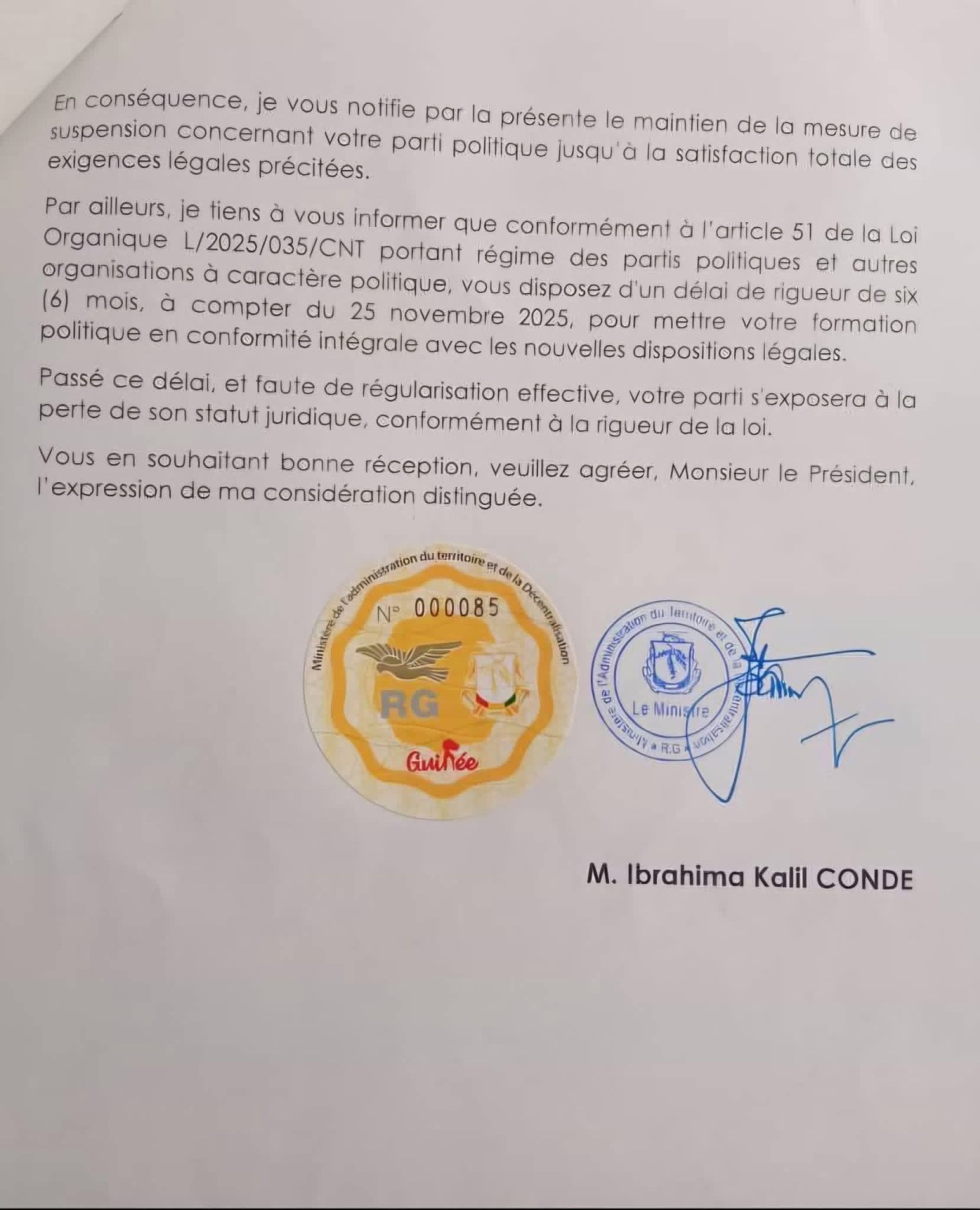 L e ministère de l’Administration du territoire et de la Décentralisation (MATD) a confirmé, dans une correspondance officielle datée du 16 décembre 2025, le maintien de la suspension de l’Union des Forces Démocratiques de Guinée (UFDG), à l’issue de l’examen des dossiers complémentaires transmis par le parti.